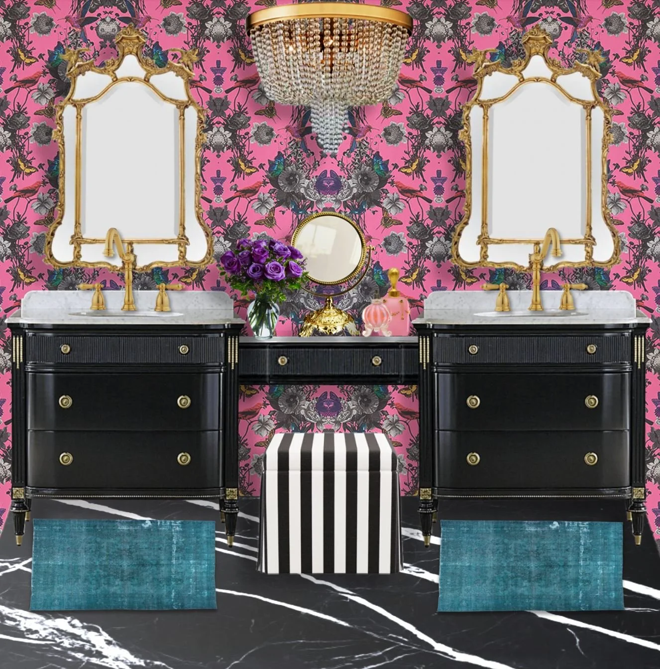 Peony-pink flora, veined black stone, heirloom brass, and graphic stripes—maximalism that’s disciplined, polished, and joyful.